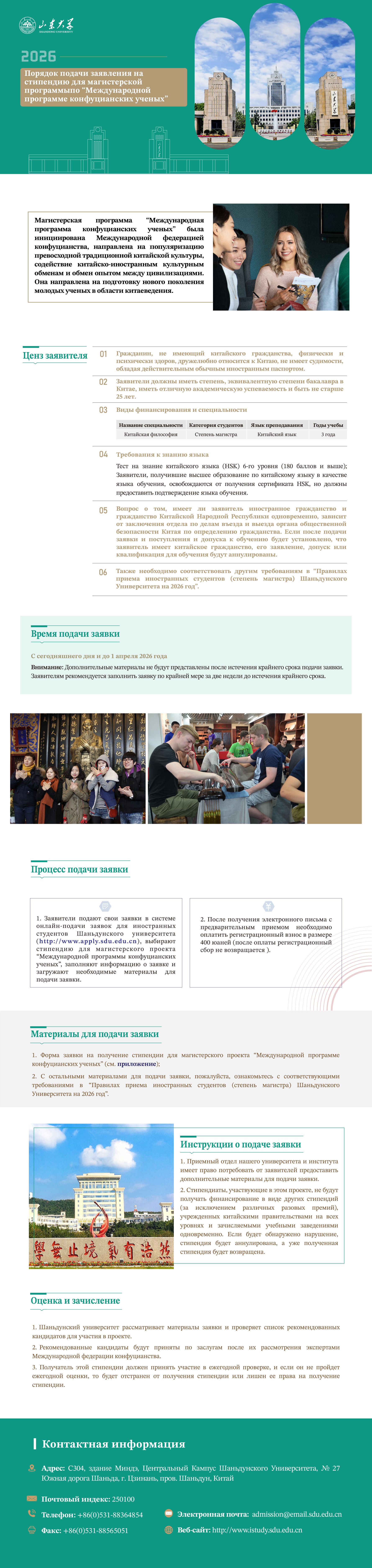 Порядок подачи заявления на стипендию для магистерской программы по “Международной программе конфуцианских ученых” Шаньдунского университета на 2026 год