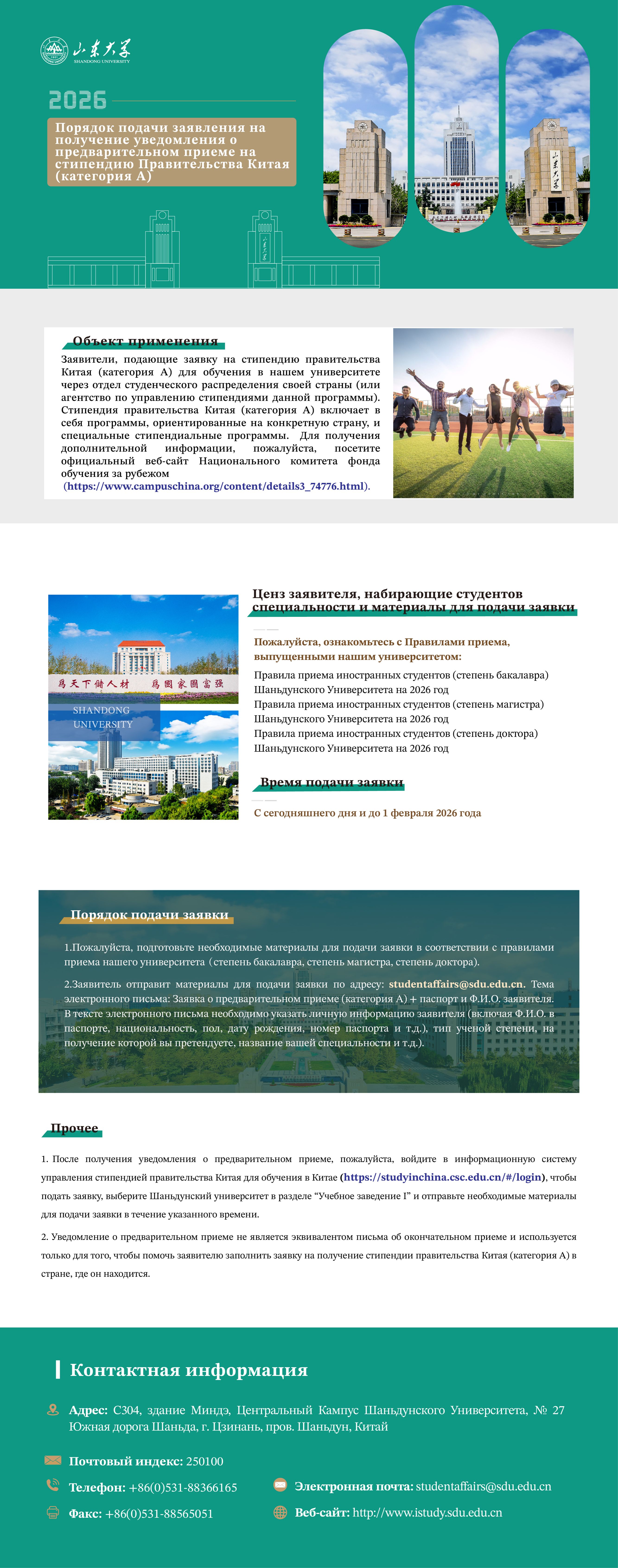 Порядок подачи заявления на получение уведомления о предварительном приеме на стипендию Правительства Китая (категория А) Шаньдунского университета на 2026 год