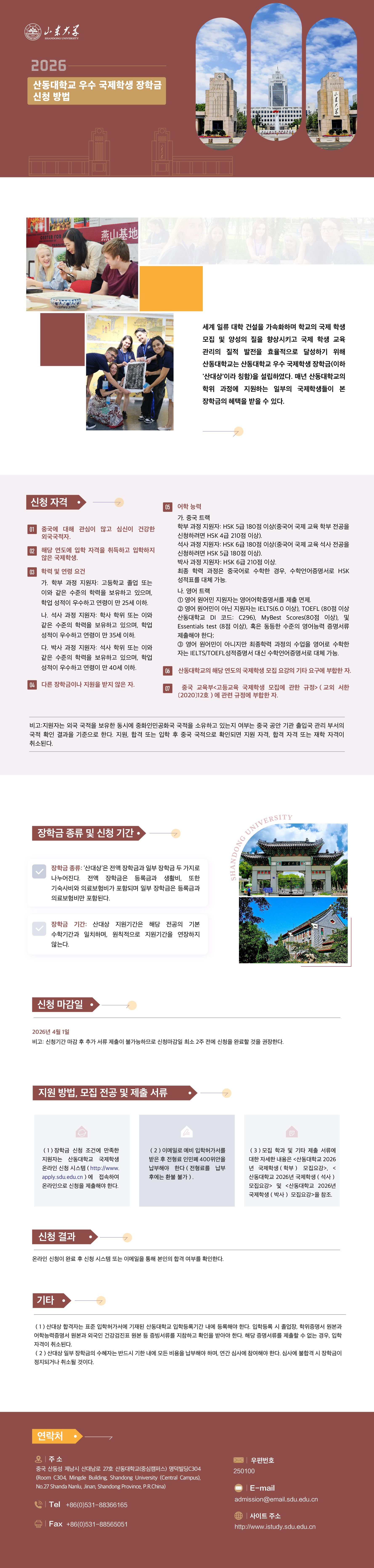 2026년 산동대학교 우수 국제학생 장학금 신청 방법