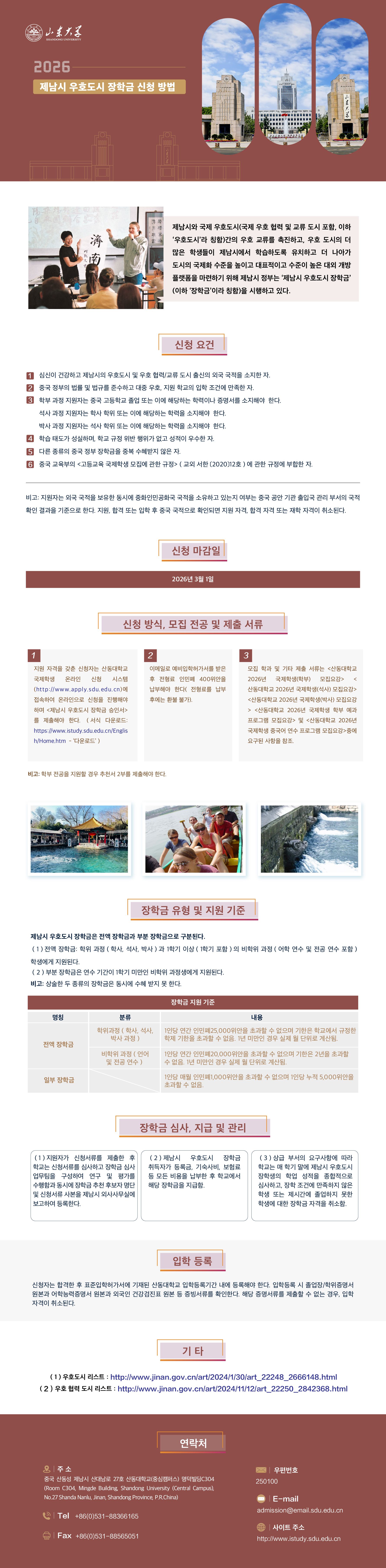 산동대학교 2026년 제남시 우호도시 장학금 신청 방법
