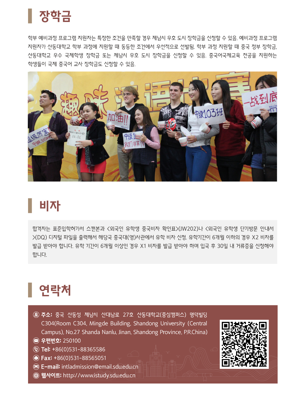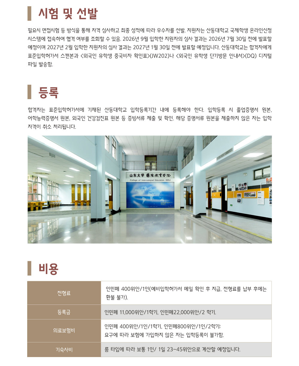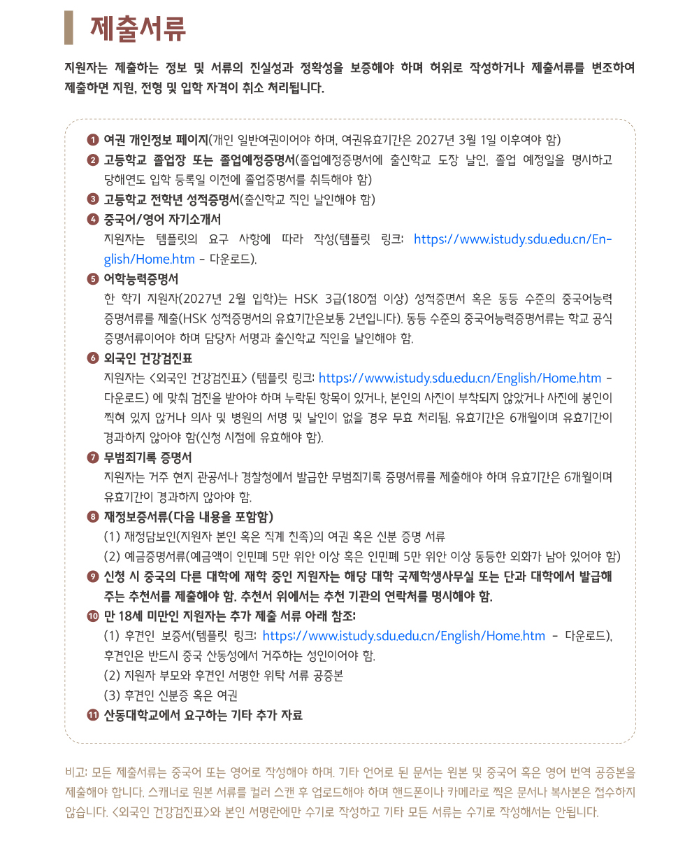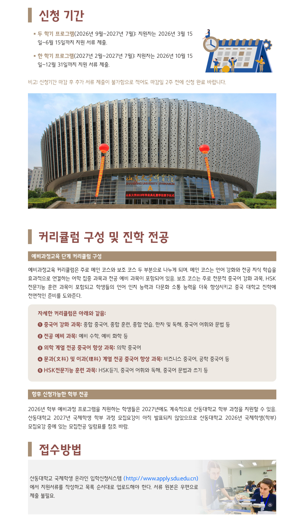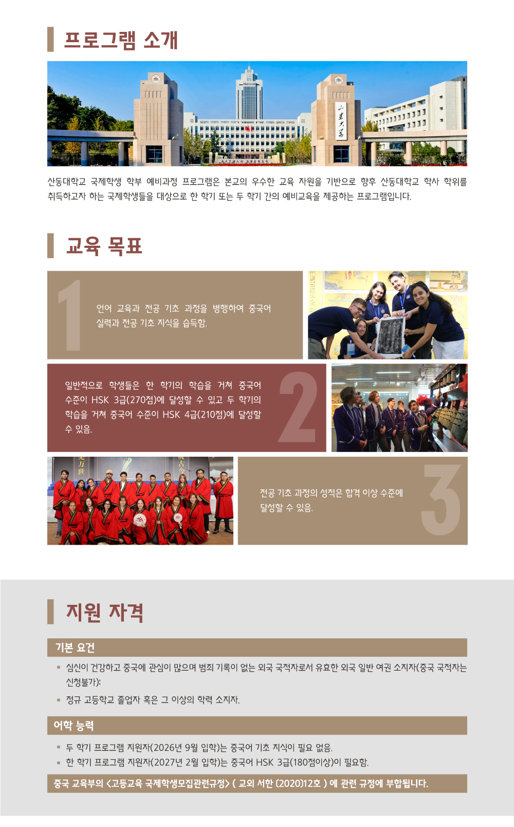 2026년 산동대학교 국제학생(학부 예비과정 프로그램) 모집요강