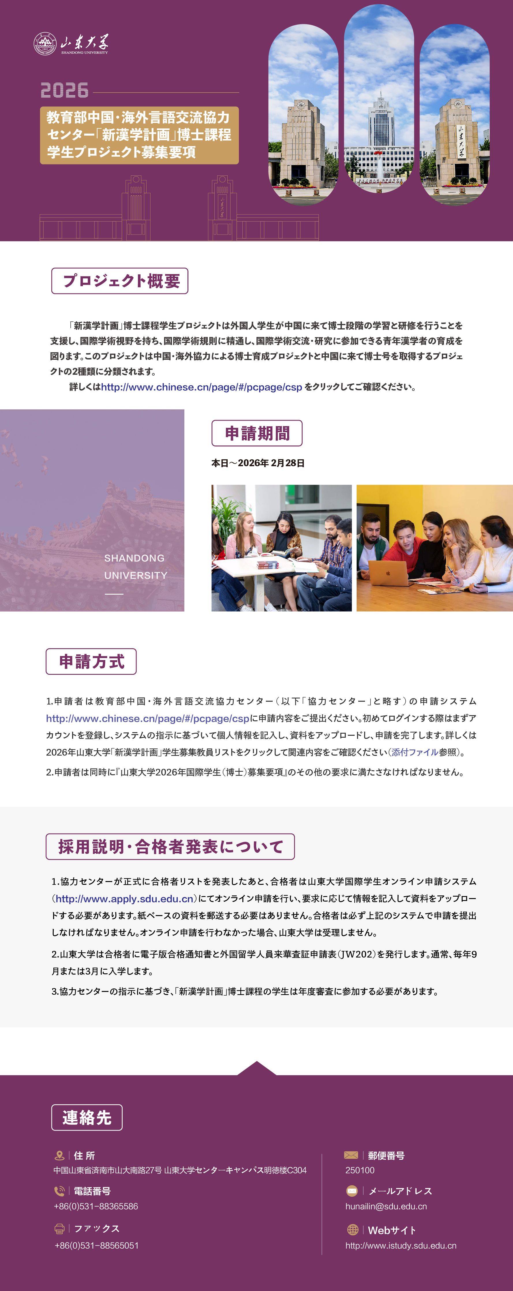 山東大学2026年教育部中国・海外言語交流協力センター「新漢学計画」博士課程学生プロジェクト募集要項