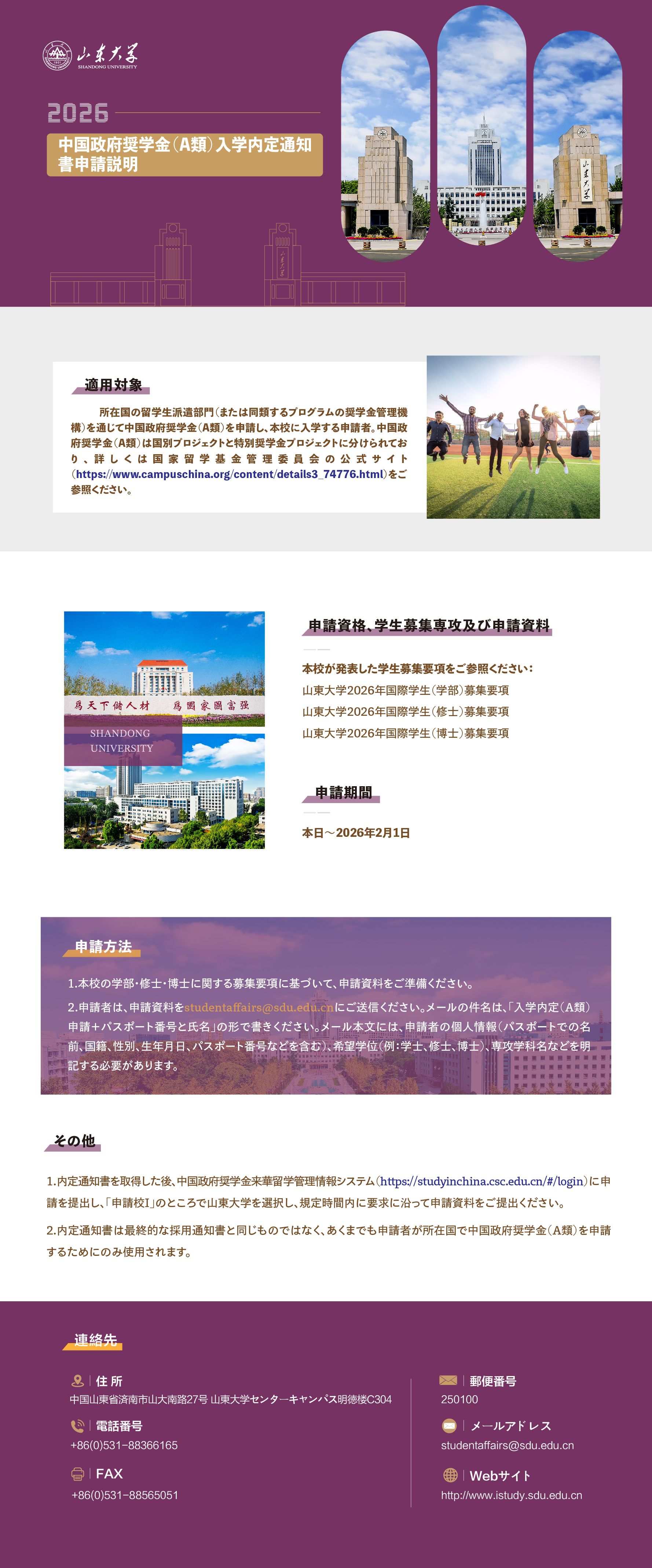 山東大学2026年中国政府奨学金(A類)入学内定通知書申請説明